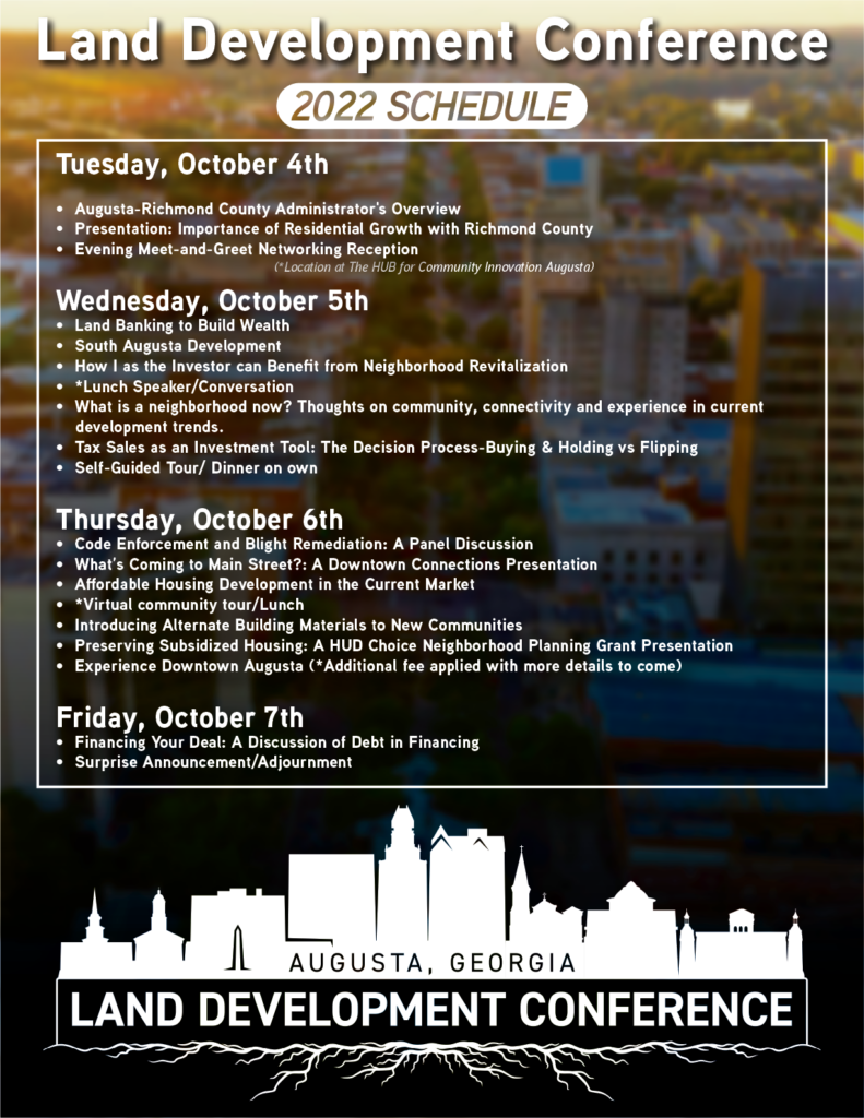 Registration is now OPEN for the 2022 Land Development Conference! Come get the latest from industry leaders, government officials, and more to take your investments to the next level. The tentative schedule is below. For more information or to register, visit www.ldconference.com, or click one of the options below!